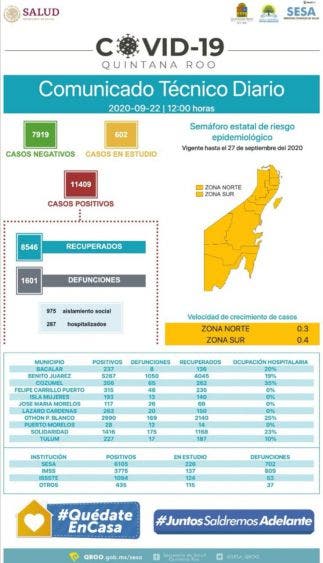 Este martes Quintana Roo presentó 26 casos nuevos de Covid-19, así como 5 defunciones más por esta causa, haciendo un acumulado a la fecha de 11 mil 409 positivos, 8 mil 546 recuperados, mil 601 defunciones y actualmente 975 personas están en aislamiento social, 287 en hospitalización y 602 estudio.