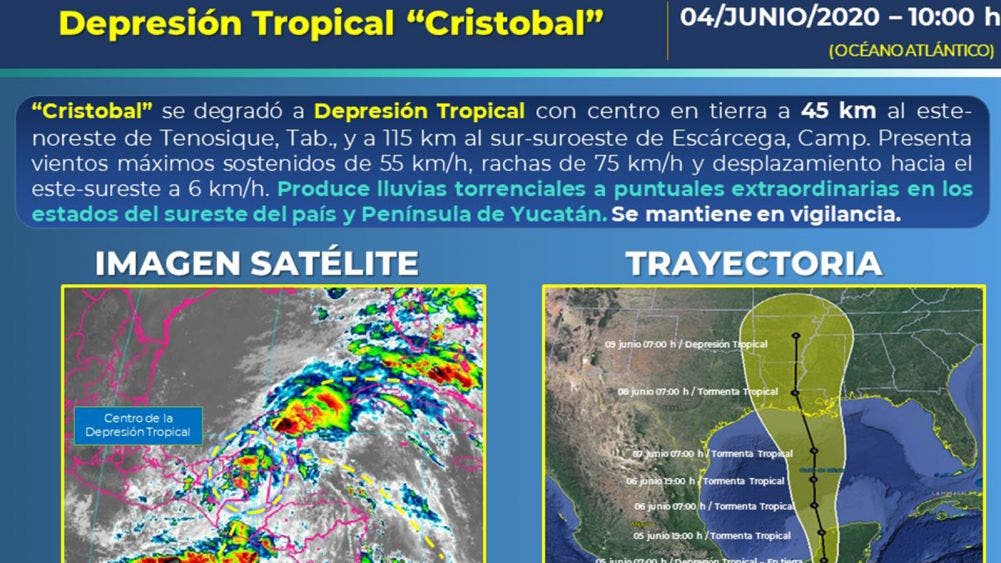 «Cristóbal» se degrada a depresión tropical.- La Tormenta Tropical Cristóbal se degradó a Depresión Tropical, y actualmente se desplaza sobre tierra en Campeche, se pronostica que ingrese nuevamente en aguas del Golfo de México, la noche de este jueves, sin embargo, mantendrá el temporal de lluvias en el sureste mexicano.