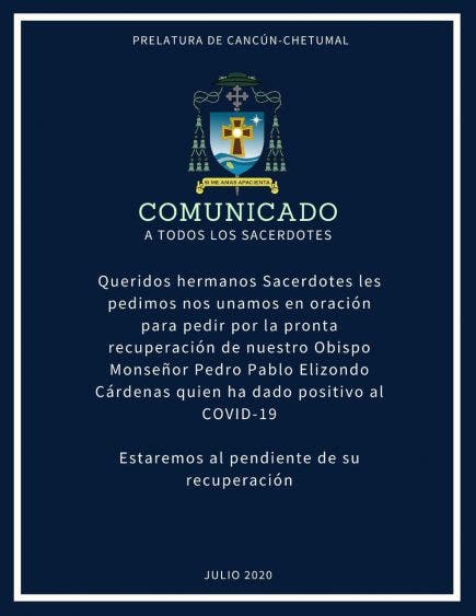 Da positivo a Covid-19 obispo de Quintana Roo.- Monseñor Pedro Pablo Elizondo contrajo el virus de Covid-19, asi lo anunció en redes sociales la Prelatura de Cancun-Chetumal, solicitando a todos los sacerdotes que se unan en oración por la salud del guía de la iglesia católica en esta entidad.