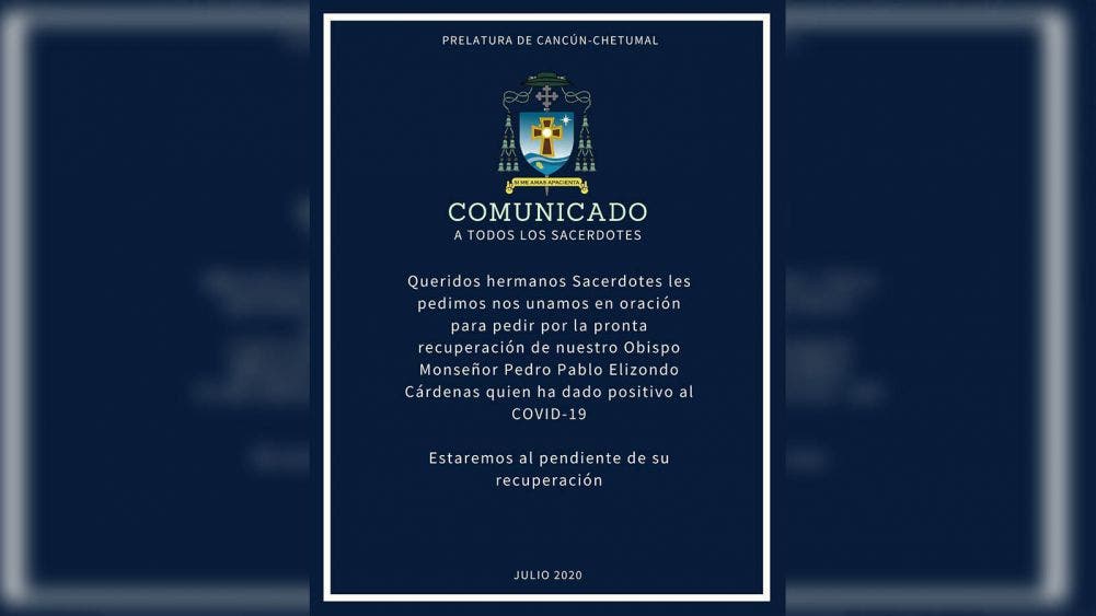 Da positivo a Covid-19 obispo de Quintana Roo.- Monseñor Pedro Pablo Elizondo contrajo el virus de Covid-19, asi lo anunció en redes sociales la Prelatura de Cancun-Chetumal, solicitando a todos los sacerdotes que se unan en oración por la salud del guía de la iglesia católica en esta entidad.