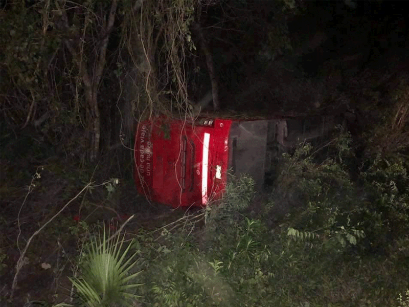 Cancún, Q. Roo.- Un autobús de pasajeros volcó anoche, tras impactarse contra una camioneta de redilas que se encontraba mal estacionada y sin la señalización adecuada en la autopista Cancún-Mérida, dejando como saldo 15 pasajeros lesionados.