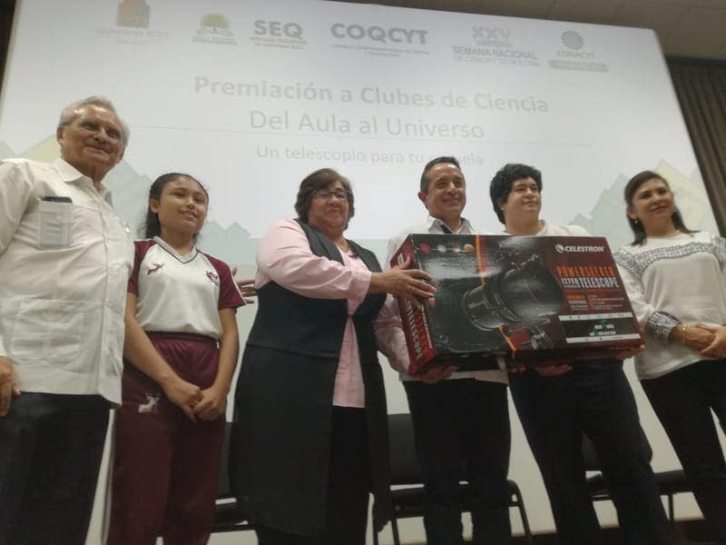 La tarde de hoy se llevó a cabo la ceremonia de premiación a los clubes de ciencia de las diferentes escuelas que resultaron ganadoras de la convocatoria “Del aula al universo 2018”, la cual se abrió en octubre pasado y convocó a estudiantes de los municipios de Benito Juárez, Othón P. Blanco, Bacalar, Felipe Carrillo Puerto, José María Morelos y Tulum,a participar para ganarse un telescopio.