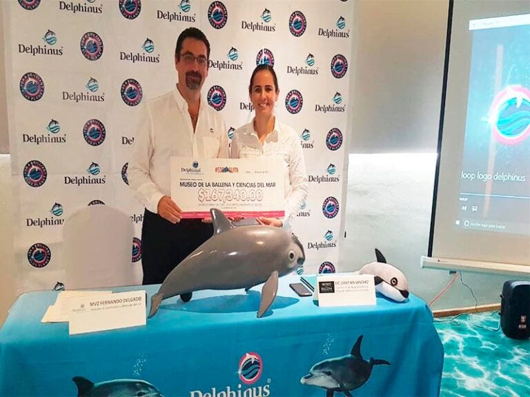 Con el objetivo de contribuir en la conservación de la vaquita marina, la cadena quintanarroense de hábitats para la interacción con delfines, Delphinus, entregó al Museo de la Ballena y Ciencias del Mar, 167 mil 340 pesos (8 mil 367 dólares americanos) para apoyar el programa de remoción de redes fantasma que realiza dicha institución a través de su buque, Narval.