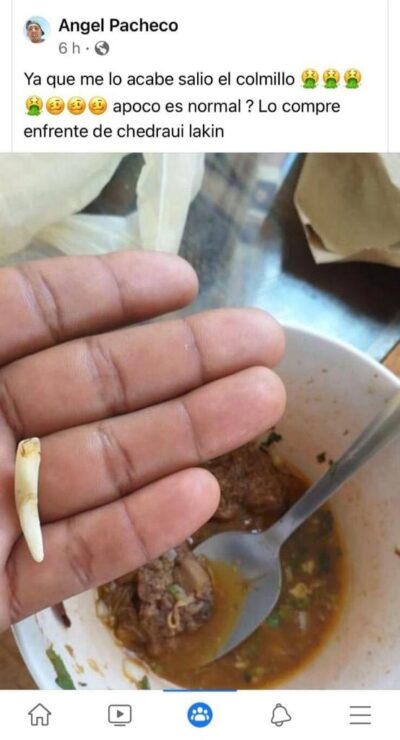 El individuo, identificado como Angel Pacheco, acompaña su fotografía con un mensaje donde señala: «Ya que lo acabe salió el colmillo…», y agrega la pregunta: a poco es normal?, refiriendo que compró esos alimentos en un local enfrente del autoservicio Chedraui de la avenida Lakín.