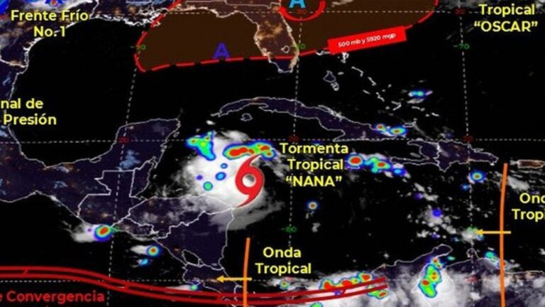 En su último reporte, el Servicio Meteorológico Nacional (SMN) informó que el centro de Nana se localizó a primera hora de este miércoles a 460 kilómetros de Puerto Costa Maya, Quintana Roo, y a 240 kms de Limón, Honduras. En las próximas horas, continuará su avance hacia el litoral de Belice, donde se espera que toque tierra a lo largo del jueves.