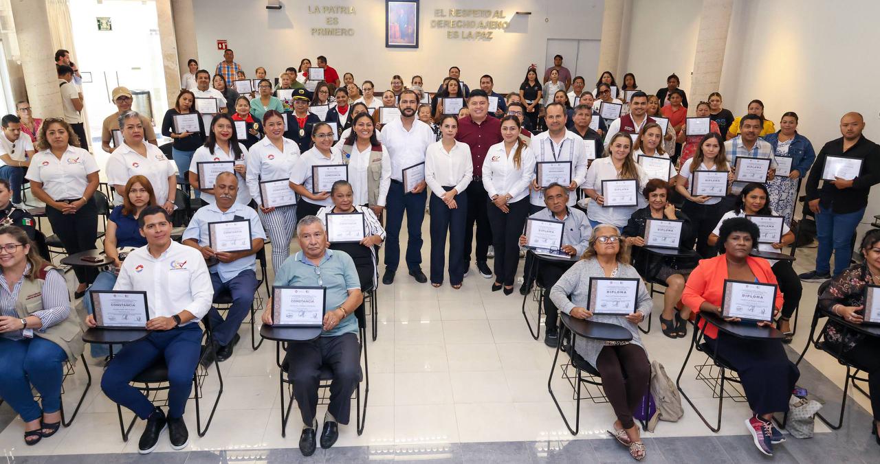 Acompañada de los integrantes del presídium, en el que se incluyó el director general de la Casa de los Saberes Jurídicos, Jorge Arturo Martínez Arufe, sede del evento, la Presidenta Municipal entregó 30 constancias, dos reconocimientos y 34 diplomas a los participantes del taller y ponentes del mismo.