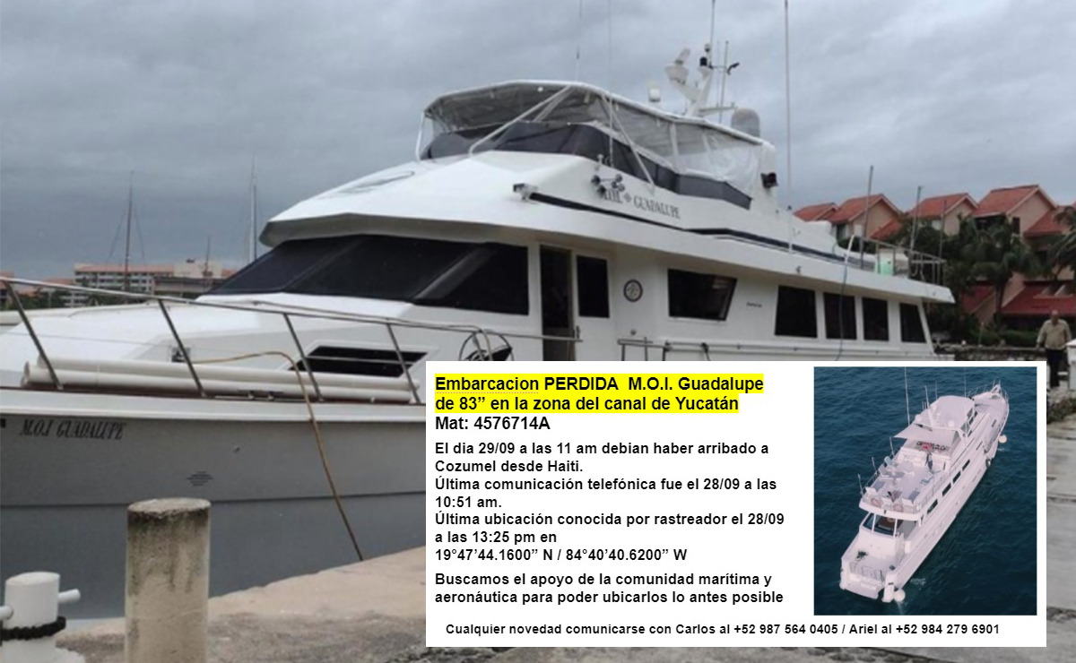 Directivos de la marina en Puerto Aventuras donde atraca el yate «Moi Guadalupe», el cual lleva tres días perdido en altamar, afirmaron en entrevista exclusiva para Turquesa News que hasta ahora no han recibido apoyo de las autoridades federales para ubicar esta embarcación.