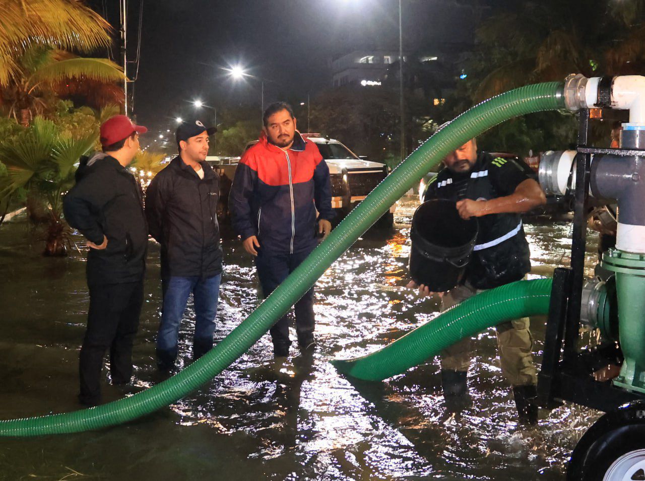 Durante esta acción, el secretario General, junto a los titulares de Protección Civil y del Heroico Cuerpo de Bomberos, Aquileo Cervantes Álvarez, supervisó el desagüe con bombas de achique en la avenida Sunyaxchen, Bonampak y la colonia Donceles.