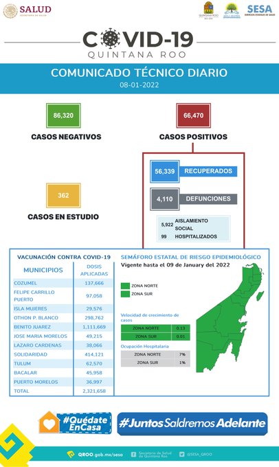 En cuanto a los esfuerzos de la campaña permanente de vacunación contra el covid-19, Sesa informó que la cifra de inoculados aumentó hoy a 2 millones 321 mil 658 dosis aplicadas del reactivo a la población de Quintana Roo.
