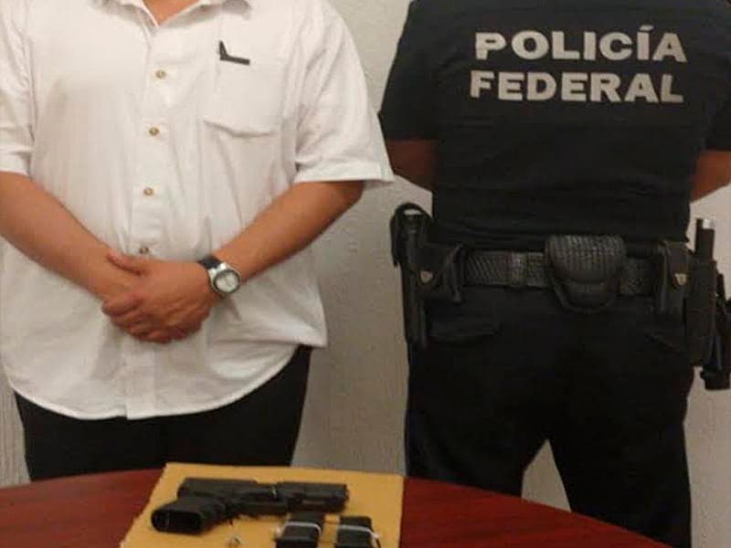 Policía Federal informó sobre la detención en el Aeropuerto Internacional de Cancún de un hombre de 46 años de edad identificado con las iniciales J.A.H.Y., quien llegó en un vuelo procedente de la Ciudad de México y solicitó la entrega de un arma de fuego que resultó sin registro alguno.