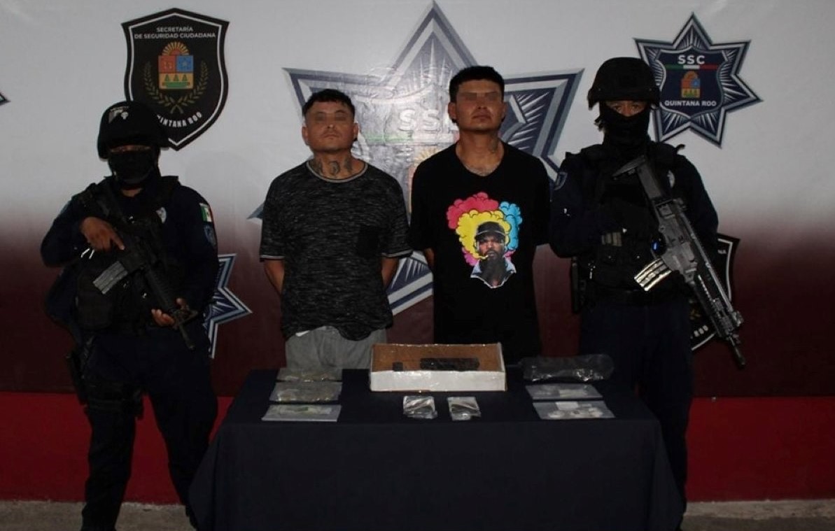 Dos hombres fueron detenidos con drogas y arma de fuego en la Supermanzana 227 de Cancún, se trata de Emir «N», alias «El Mincho», y Jesús «N», alias «Peluquín», por su probable participación en delitos contra la salud y portación ilegal de arma de fuego en Cancún.