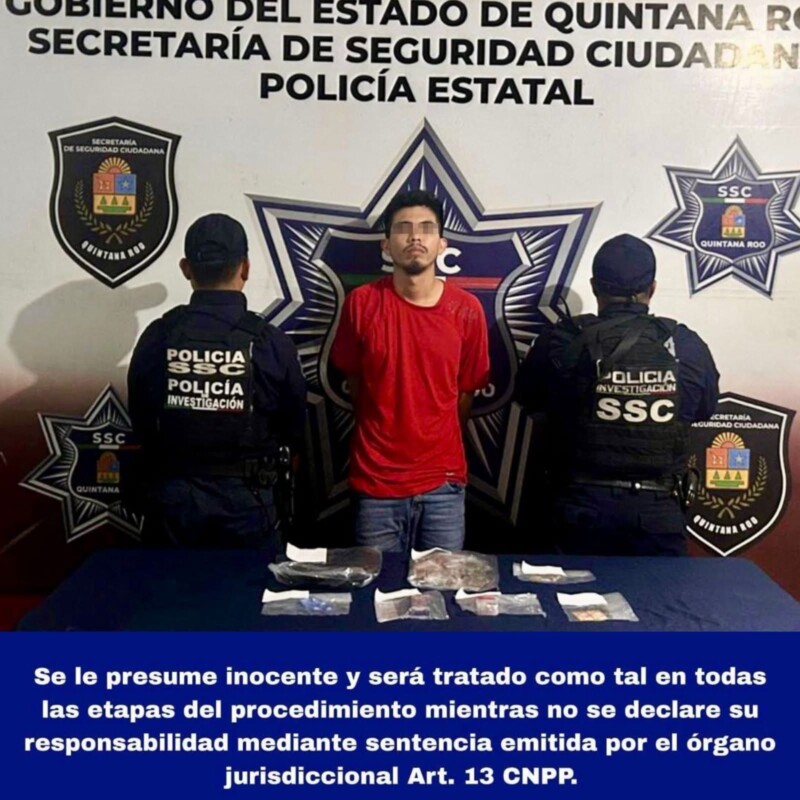 En una segunda intervención, agentes de investigación detuvieron a Sergio “N”, presunto vendedor de droga, cuando manipulaba bolsitas con vegetal verde con las características de la marihuana sobre la Avenida Chetumal, en la supermanzana 260, fraccionamiento Prado Norte.