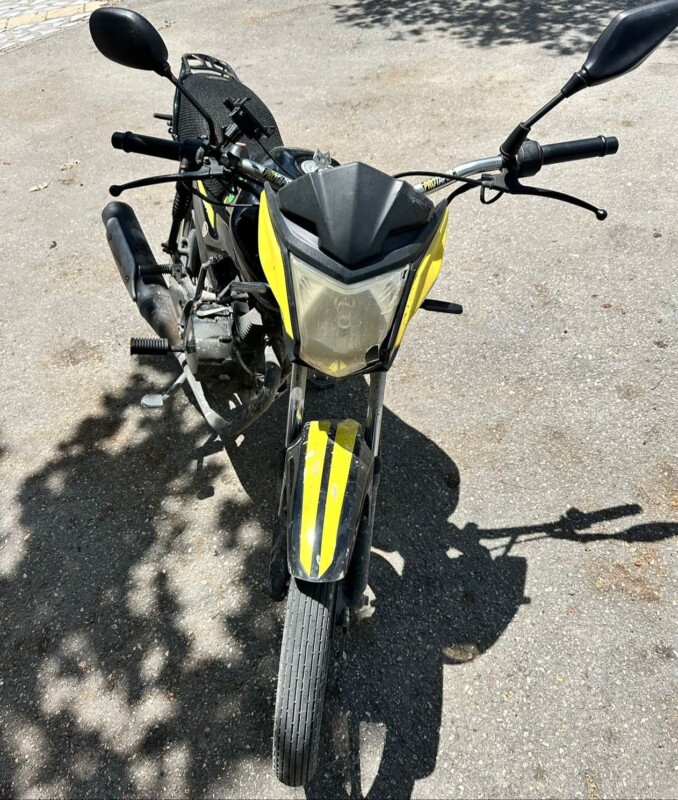 Una motocicleta color negro con franjas amarillas de la marca Italika, modelo FT150, sin placas de circulación, una mochila color rosado y una sobaquera color negro.