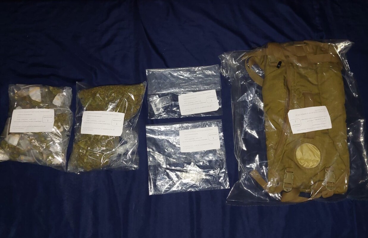 Con el fin de evitar impactar a esta persona, los oficiales tuvieron que frenar de forma brusca y en un movimiento involuntario, el sujeto alzó las manos al mismo tiempo que se le cayó una bolsa mediana de plástico transparente que en su interior contenía hierba verde con las características de la droga conocida como marihuana.