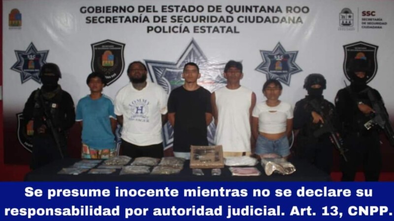 Por su presunta participación en delitos contra salud, la Secretaría de Seguridad Ciudadana de Quintana Roo logró la detención de Dianeli Luceli “N.”, Moisés “N.”, Isaías “N.”, María Angélica “N.” y Ángel de Jesús “N.”, quienes actualmente se encuentran puestos a disposición de las autoridades correspondientes, dentro del término legal para resolver su situación jurídica.