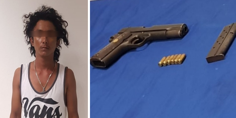 Asimismo, el sospechoso empezó a tomar una actitud evasiva y nerviosa, por lo que al realizar una inspección le fue hallada un arma de fuego, calibre .9mm, color negro con un cargador y seis cartuchos.