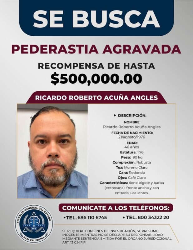 Ricardo Roberto Acuña Angles, ex profesor de una escuela primaria en Mexicali, Baja California, fue detenido la tarde de este sábado en el residencial Santa Fe de la supermanzana 525 de Cancún, el presunto pederasta era buscado por ultraje sexual de 14 menores.