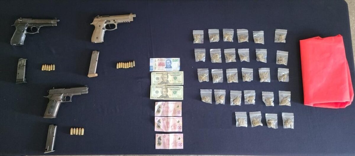 Estas acciones motivaron a los agentes a detener a los tres masculinos, quienes se encontraban en posesión de 28 bolsas de plástico con hierba verde similar a la marihuana, tres armas cortas con 20 cartuchos útiles, 650 pesos mexicanos y 40 dólares americanos.