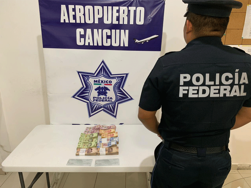 Cancún, Quintana Roo.- Elementos de la Policía Federal (PF), adscritos al Aeropuerto Internacional de Cancún (AIC), detuvieron a dos personas que pretendían abordar un vuelo con cerca de 300 mil pesos en efectivo.