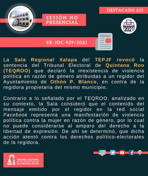 Los magistrados de la Sala Regional Xalapa del Tribunal Electoral del Poder Judicial de la Federación (TEPJF) confirmaron por unanimidad que si existe violencia política por razón de género atribuidas al regidor Adrián Sánchez Domínguez del Ayuntamiento de Othón P. Blanco, en contra de la regidora propietaria del mismo municipio, Martha Bella Reyes.