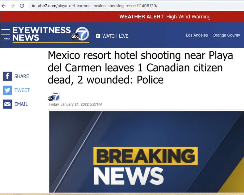 Hace apenas unas horas, un solitario pistolero disparó contra varios visitantes de origen canadiense, a los cuales lesionó gravemente muriendo mas tarde uno de ellos en un hospital de Playa Del Carmen.