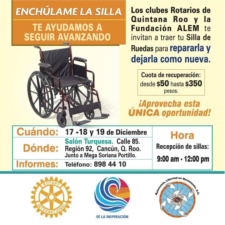 Señaló que incluso se recibirán aquellas que necesiten reparación, ya que todo ello se enmarca en el programa «Enchúlame la silla”, patrocinado por el Club Rotario Jardines de Cuernavaca con el apoyo de seis clubes de Quintana Roo.