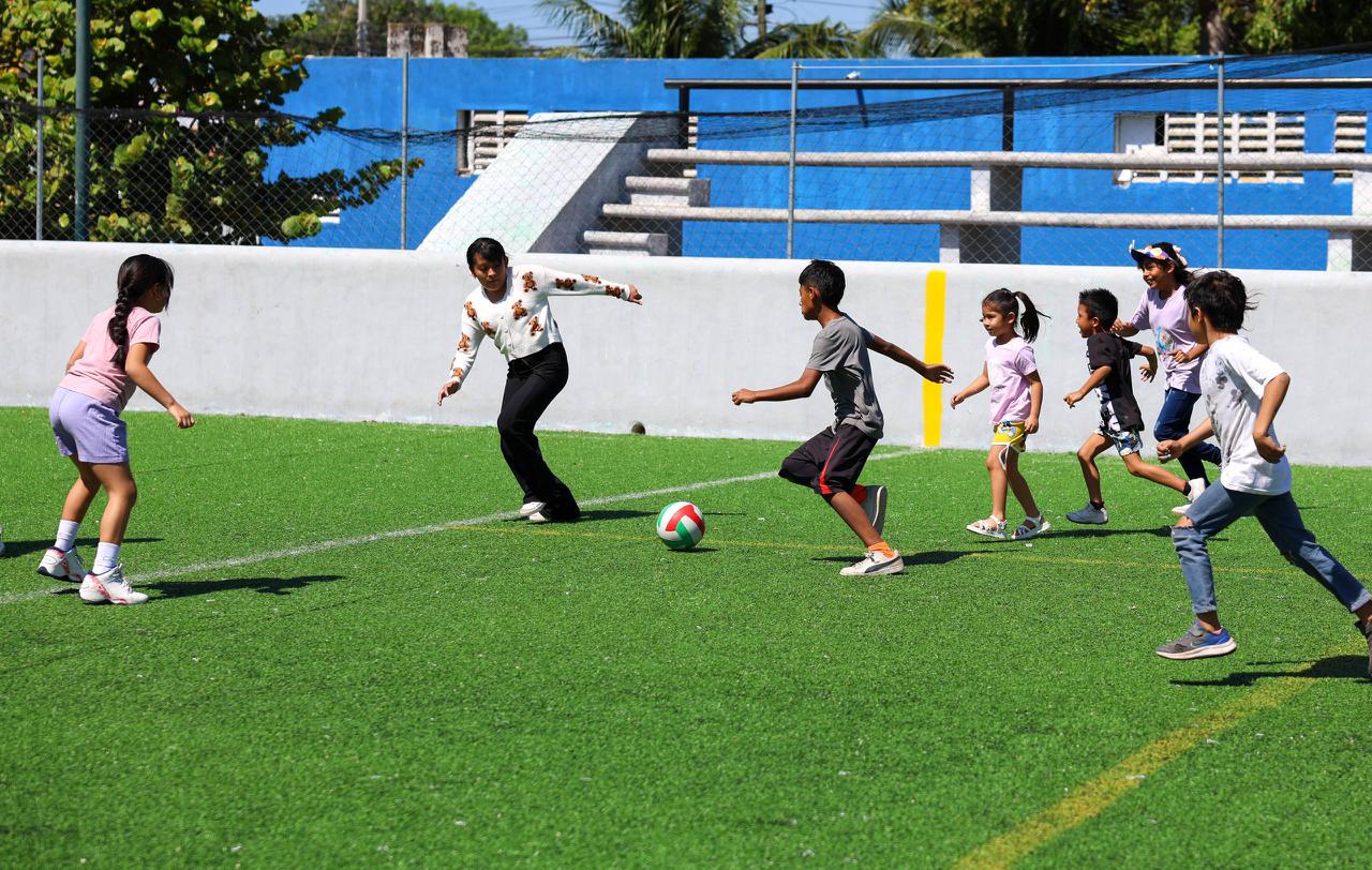 Posteriormente, las y los niños con viseras de foami que realizaron y decoraron previamente, salieron a la cancha de pasto sintético “Joga Bonito” en la Unidad Deportiva “Arcoíris” de la Supermanzana 96, a realizar un partido de futbol con la invitada.