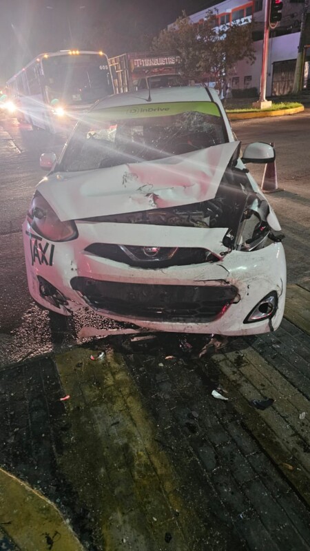 Se trata de una unidad Nissan, modelo March, color blanco con verde, placas: B398TMP de Quintana Roo, taxi con número económico 4983 que era conducido por Luis G.M., de 29 años con domicilio en Galaxias Guadalupana.