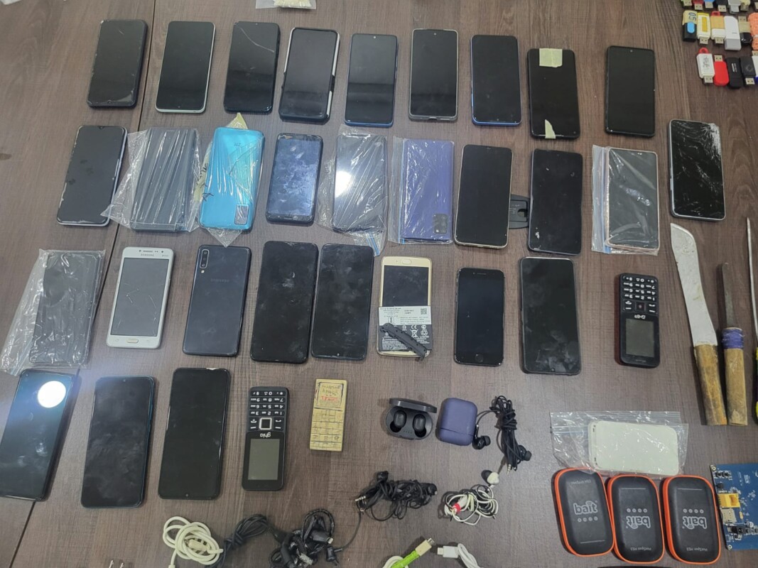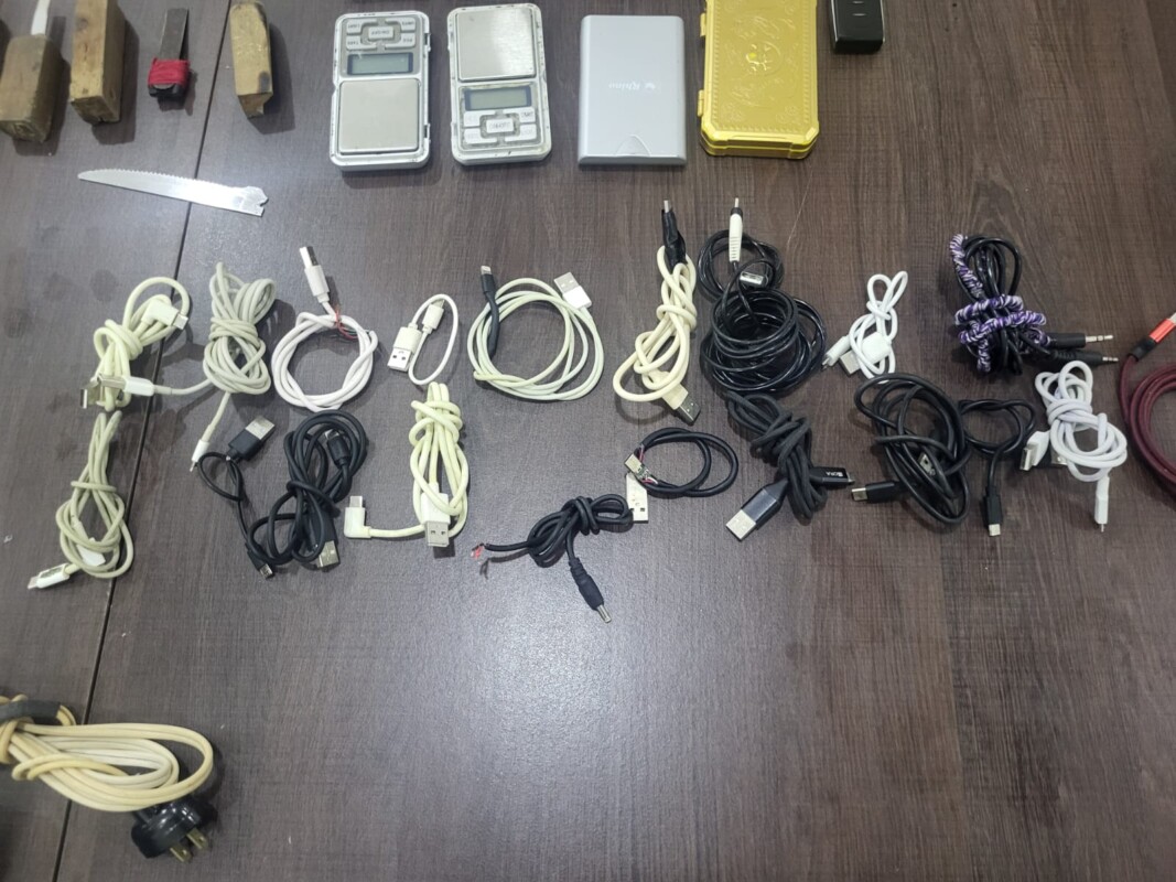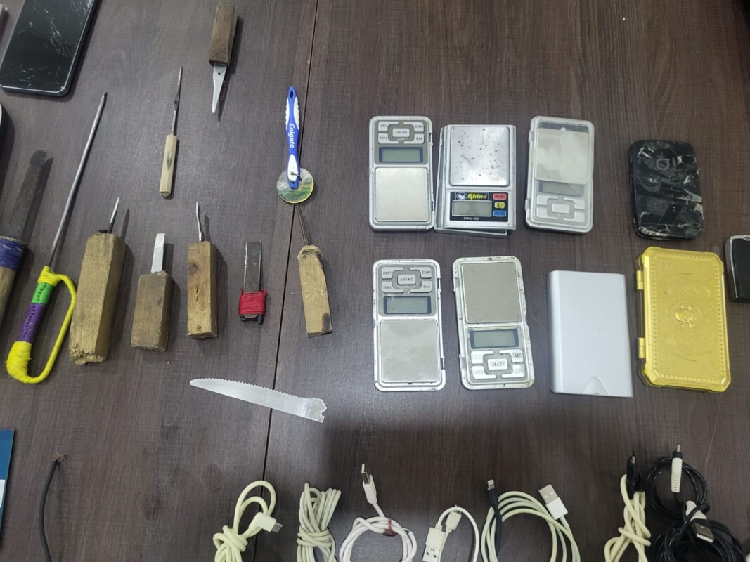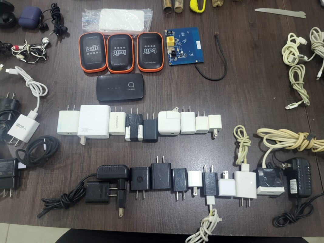 Durante la inspección se encontraron los siguientes objetos que fueron asegurados: 32 teléfonos, 37 cargadores, tres audífonos, 46 USB, 12 puntas, 19 cables USB, nueve básculas grameadoras, un cargador de laptop, nueve adaptadores USB y seis módem.
