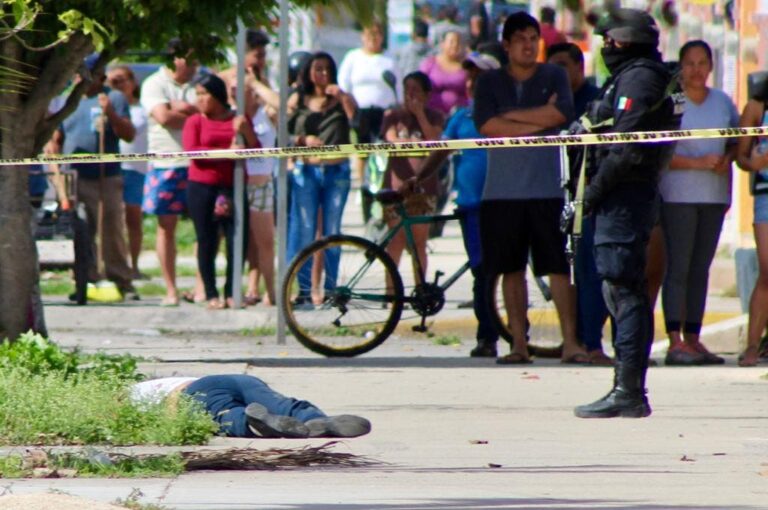 Una vez ahí, elementos de la Policía Municipal y paramédicos de la Cruz Roja Mexicana encontraron a un sujeto de entre 30 o 35 años de edad, mismo que yacía ya sin vida sobre la banqueta, con diversos impactos de arma de fuego.