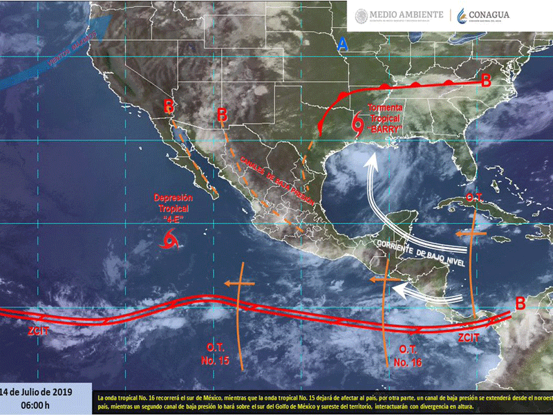 En vigilancia la tormenta tropical «Barry», localizada en tierra sobre el estado de Louisiana, EU., mientras que en el Océano Pacífico, la depresión tropical «Cuatro-E» al sur de la Península de Baja California, se desplaza hacia el oeste-noroeste a 22 km/h.