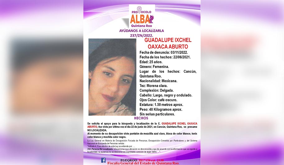 La Fiscalía General del Estado de Quintana Roo (FGEQROO), activó la ficha de búsqueda con el numero de expediente 237/ZN/2022, para solicitar a la ciudadania apoyo para localizar a Guadalupe Ixchel Oaxaca Aburto, de 25 años.