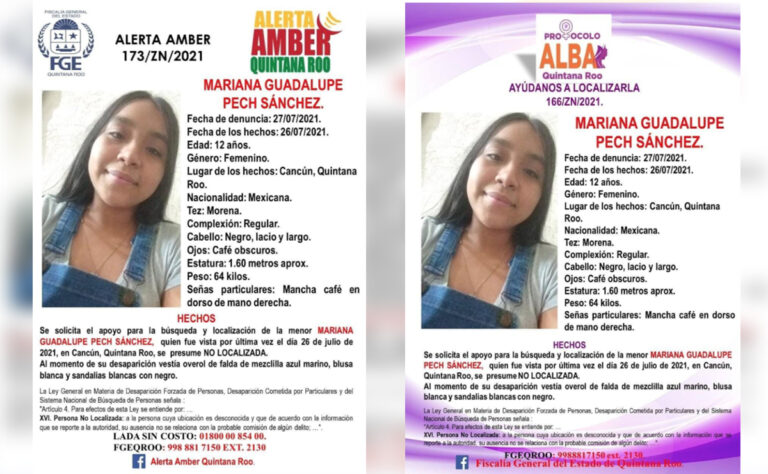 El mensaje que la propia madre compartió en un grupo de redes sociales menciona «Hola buenas noches, me podrían ayudar a encontrar a esta persona, es una niña de 12 años, se llama Maria Guadalupe Pech Sánchez, desapareció ayer en la tarde, estaba vestida como en la foto, si la ven marquen al número 9984871243».