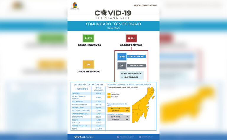 Respecto al avance en la aplicación de vacunas, hasta este momento se han suministrado 133 mil 328 dosis, de las 149 mil 740 que se han recibido hasta este momento en Quintana Roo.