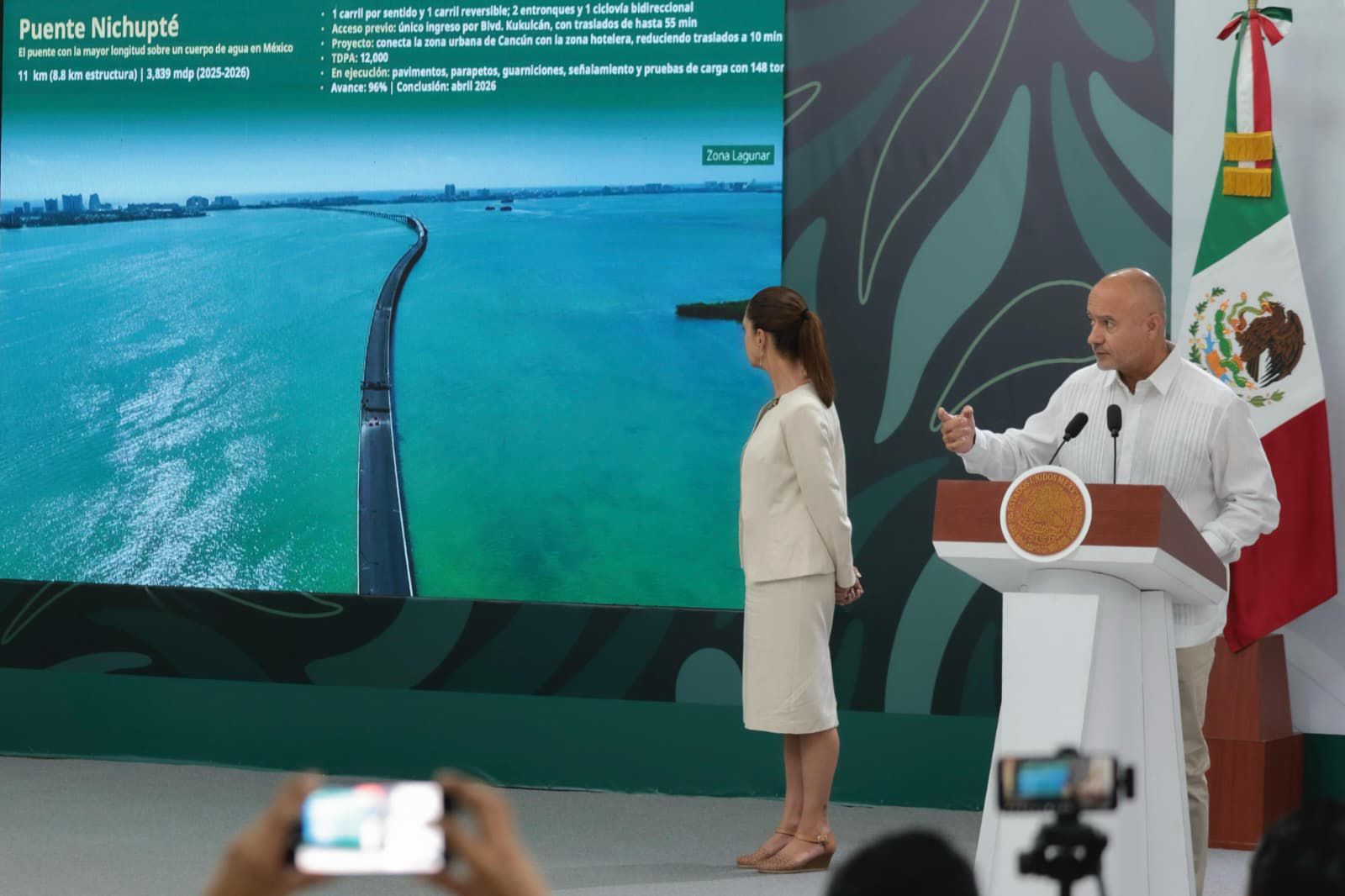 Además, el Puente Nichupté, que se convertirá en el puente con la mayor longitud sobre un cuerpo de agua y que reducirá los tiempos de traslado de una hora y media a 10 minutos, tiene un avance del 96 por ciento, ya han iniciado las pruebas de carga y se proyecta su conclusión a finales de abril de este año; a su término, iniciarán los trabajos en el Entronque Kukulcán, que es un puente de dos carriles por sentido y se proyecta terminar las obras el próximo diciembre.