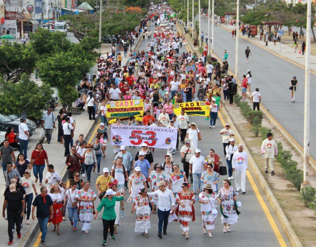 Con un contingente conformado por 9 bloques: Banda de Guerra, Cancún de Ayer y Hoy, Cancún Cultural, Cancún Turístico, Cancún Joven, Cancún Deportista, Cancún Inclusivo, Cancún nos une y Club de motos; la Primera Autoridad Municipal lideró la marcha, saliendo desde la Av. Chichén Itzá con Tulum, en dirección al Parque de Las Palapas.