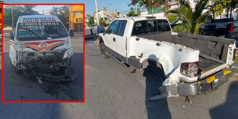 Un encontronazo entre una unidad del servicio público de pasajeros y una camioneta del servicio particular, se registró esta mañana en la Supermanzana 50 de Cancún sin que se registraran personas lesionadas.