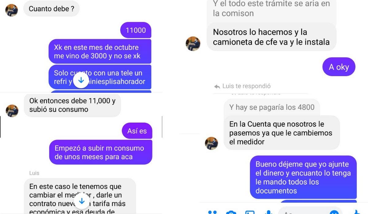 En las capturas de pantalla se muestra una conversación que un usuario tuvo con Luis Corona, la persona que presuntamente trabaja en CFE y es encargada de “Ahorra en CFE”.