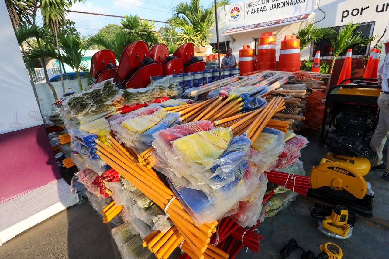 Personal de la dirección de Parques y Áreas Jardinadas, adscritos a la Dirección General de Servicios Públicos, recibieron de manos de la Presidenta Municipal, Ana Paty Peralta, herramientas y equipo para el mantenimiento de la infraestructura urbana, parques, espacios públicos y áreas comunes del municipio de Benito Juárez.