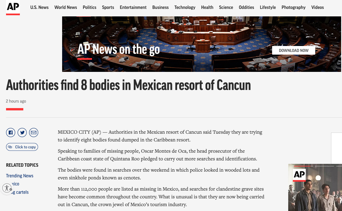 La propia nota de la Agencia AP, señala que varios de los cuerpos fueron encontrados en un barrio pobre a unos 15 kilómetros (10 millas) de la playa y la zona hotelera de Cancún, pero relativamente más cerca del aeropuerto del centro turístico.