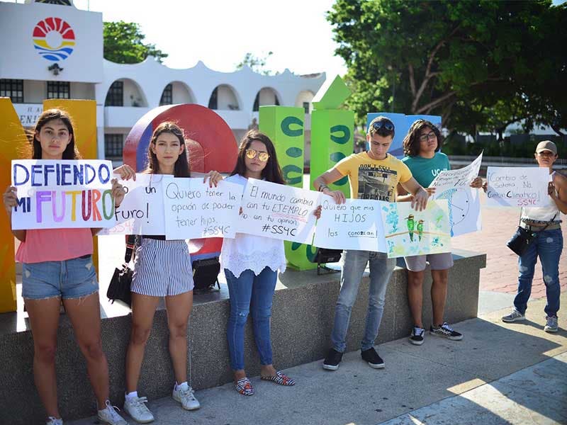 Un grupo de jóvenes de diferentes escuelas se instaló hoy en las afueras del Palacio municipal de Cancún, uniéndose al movimiento mundial denominado School Strike 4 Climate, en boga desde hace algunos años en diferentes partes del mundo.