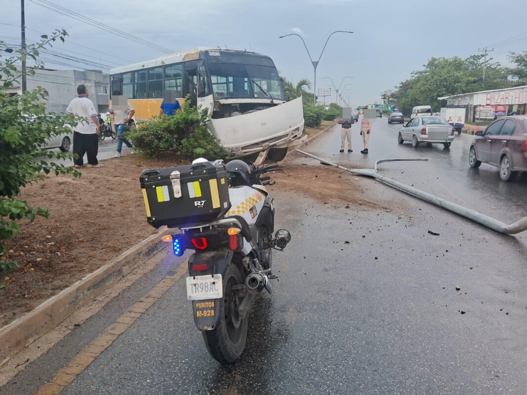 La mañana de este viernes, el chofer de un autobús de transporte de personal perdió el control cuando transitaba por la avenida José López Portillo en Cancún, a consecuencia del exceso de velocidad sobre pavimento mojado, lo que dejó cuantiosa pérdidas materiales.