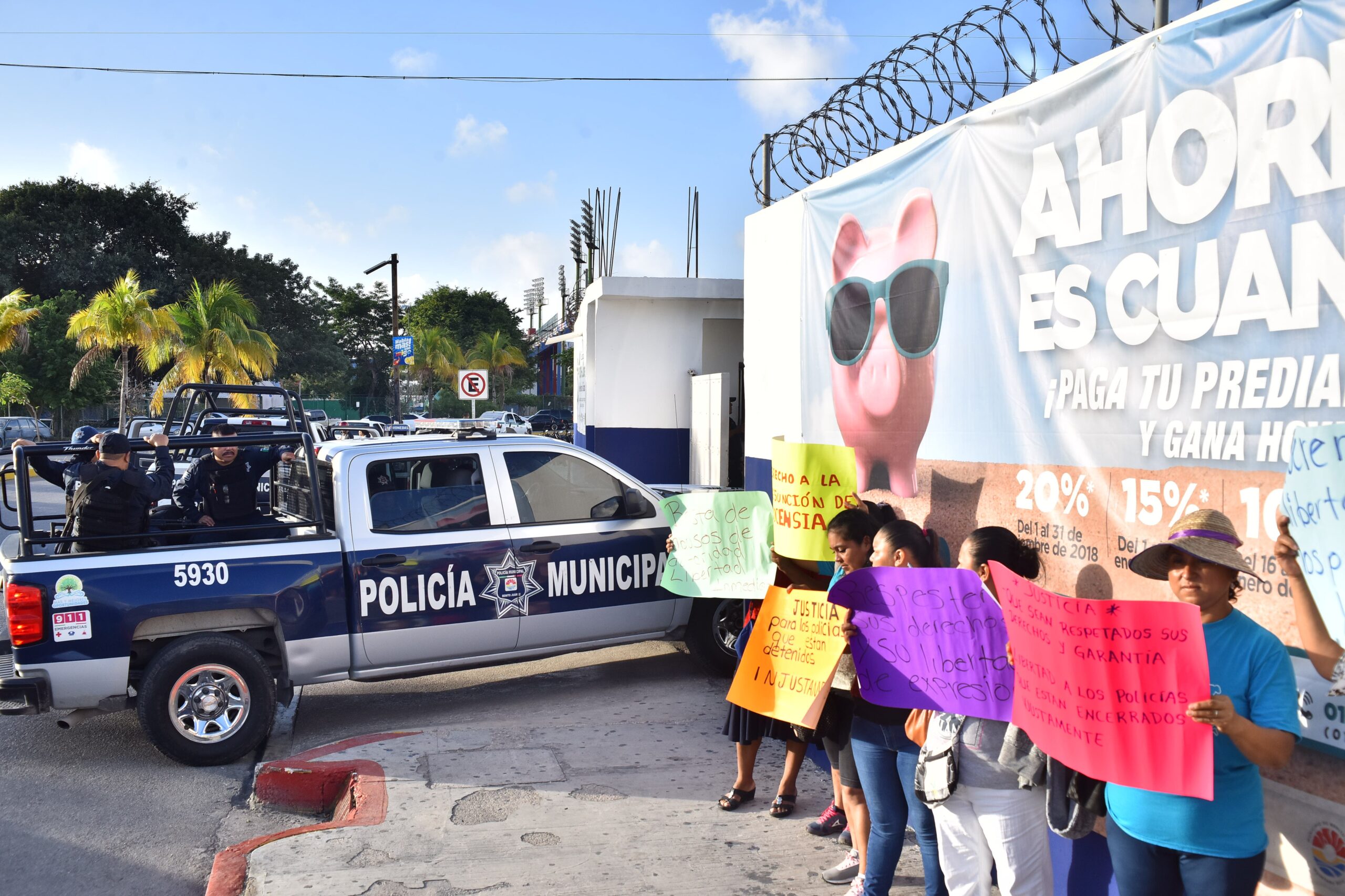 Cancún, Q.Roo (Infoqroo).– Familiares de policías municipales encarcelados por la administración de Alberto Capella Ibarra y de Jesús Pérez Abarca, titulares de Seguridad Pública Estatal y Municipal, respectivamente, se manifestaron con cartulinas a las afueras de la Secretaría Municipal de Seguridad Pública y Tránsito en Benito Juárez Cancún, exigiendo la libertad de los uniformados. Exigen liberación de 16 policías presos en Cancún.