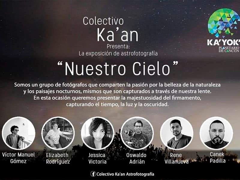 El colectivo Ka’an es un grupo de fotógrafos que comparten la pasión por la belleza de la naturaleza y los paisajes nocturnos mismos que son capturados a través de la lente, donde entre los seis fotógrafos que participará en esta exposición se encuentra: Víctor Manuel Gómez, Elizabeth Rodríguez, Jessica Victoria, Oswaldo Adrián, Rene Villanueva y Canek Padilla.
