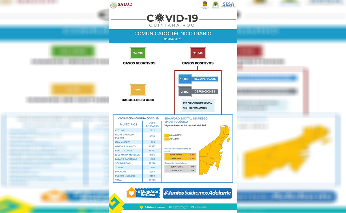 Cabe señalar que, este reporte indica que a la fecha se han aplicado 71 mil 299 dosis de las vacunas contra el COVID 19, tanto a adultos mayores como a personal de Salud, siendo Othón P. Blanco y Benito Juárez los que más han recibido con 17 mil 537 dosis, y 15 mil 433, respectivamente.