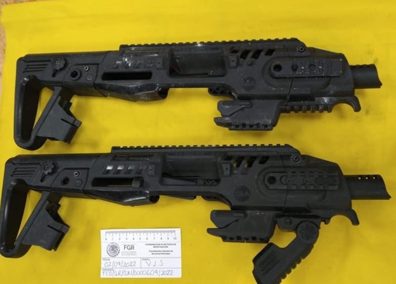 Además, una maleta que contenía 23 bolsitas de plástico con marihuana con un peso total de 25 gramos, una maleta en la que había dos adaptadores para pistola con culata retráctil, un fusil sin culata, un cargador de tambor y una mira posterior para fusil, dos cargadores desabastecidos y una camioneta sin placas de circulación.