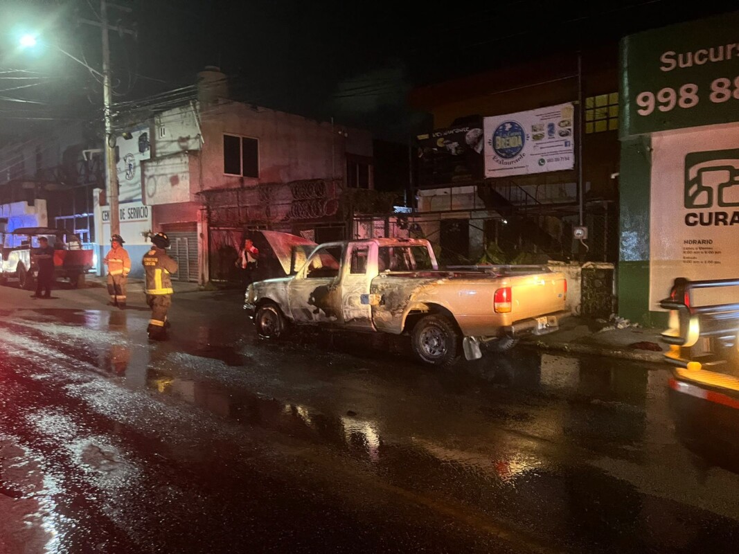 Una camioneta fue consumida totalmente por el fuego durante la noche de este jueves en la Avenida Talleres de la ciudad de Cancún. El reporte inicial mencionó víctimas atrapadas en las llamas, lo cual generó una gran movilización de los cuerpos de emergencia.