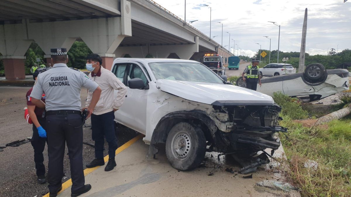 Fuerte accidente en la entrada a la estación del Tren Maya en Cancún; debido al fuerte impacto, una de las unidades volcó. Hubo tres heridos.