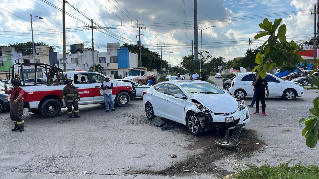 Fuerte accidente de tránsito sobre la avenida Chac Mool al cruce con la avenida Jacinto Canek, en la SM 223 del Fraccionamiento Los Héroes, donde dos vehículos chocaron y uno volcó, dejando a su conductora y otra mujer atrapadas y lesionadas.