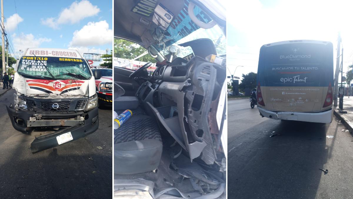 Un fuerte accidente de tránsito entre una combi del servicio público de pasajeros y un autobús de transporte de personal hotelero, se registró esta mañana en la avenida López Portillo y Kabah en la Supermanzana 59 de Cancún, con saldo de al menos 20 personas lesionadas.